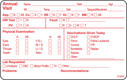 Use these labels to place on patient charts for a quick and easy way to note important information during an annual exam. Useful for both canine and feline.